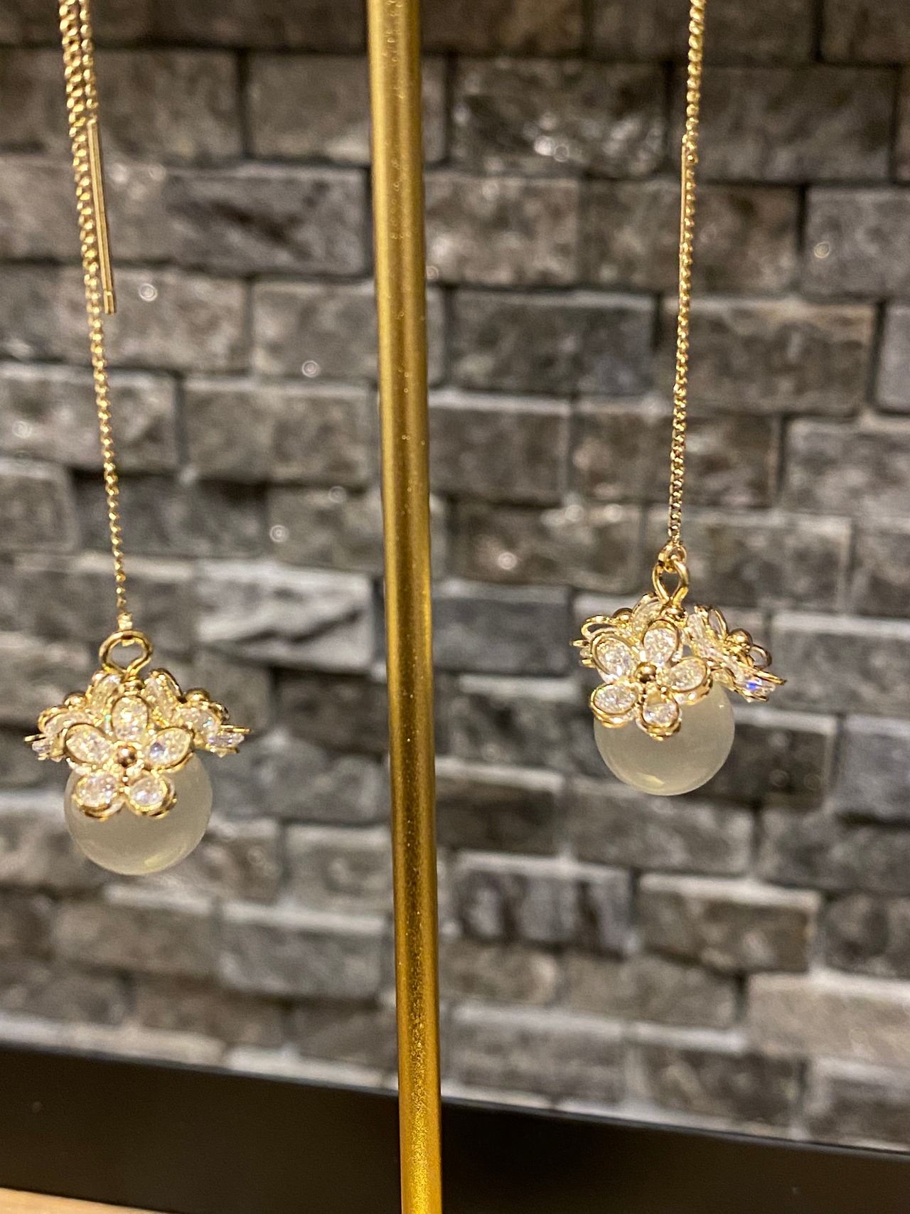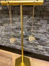 半透明のガラスボールにスワロフスキーのフラワーがたくさん付いており、かつチェーンなので、一番可愛い部分がゆらゆら♡作りが繊細なピアス♡